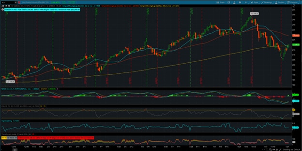 Today we have Live Cattle (/LEZ25) on the chart set to a 1-year, 1-day aggregation. We can see the pull back from November 26th, where cattle hit a low of 204.55 and the candle prior to that, which is the 24th, where cattle last traded limit down.