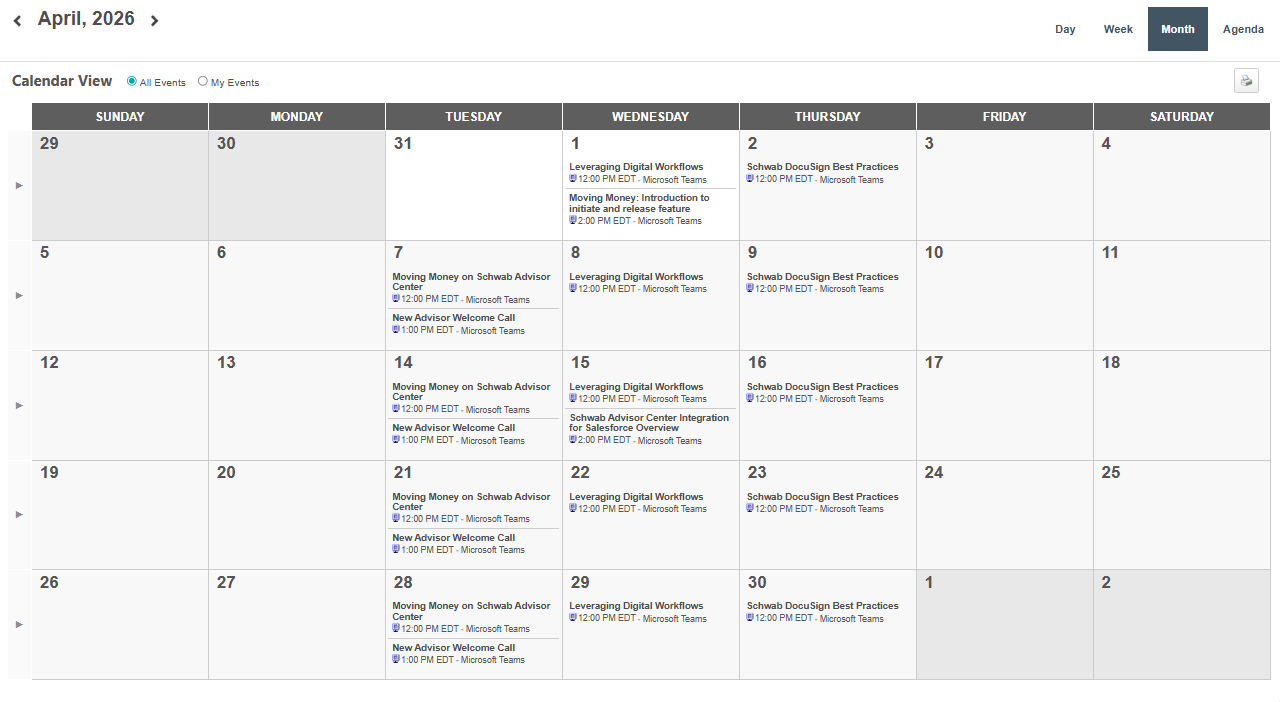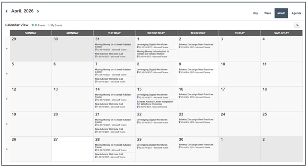 You don't have to catch a specific session to stay current on key Schwab tools. These live webcasts are offered on a consistent weekly schedule, so you can join when it works for you and also revisit topics anytime for a refresher. As features continue to evolve, you can return to sessions to stay up-to-date and get more value from the platforms you use every day.