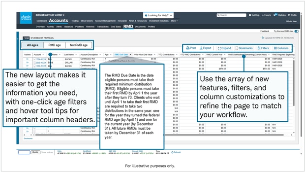 The RMD tab on Schwab Advisor Center has been completely redesigned to streamline your workflow when reviewing and managing your clients' retirement accounts. Based on advisor feedback, these enhancements vastly improve the usability of the page and let you customize the experience to meet your firm's unique needs. Here are some of the most important enhancements.