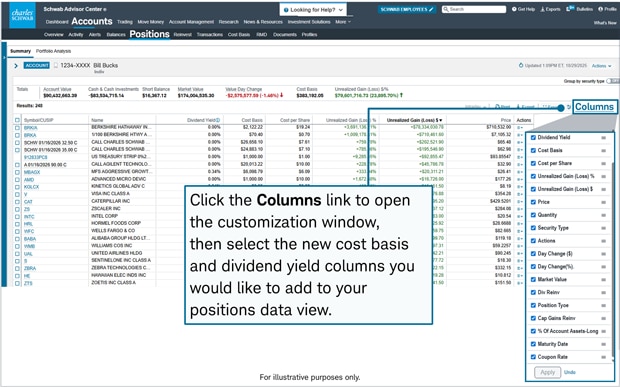 View cost basis and dividend yield information with new columns on the Positions page