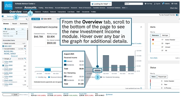 The Overview tab on Schwab Advisor Center has a new Investment Income module, which provides details about dividend and interest income in an account, along with a graphical representation of dividend and interest income over time. Hover over the bars in the graph to view more detailed information.