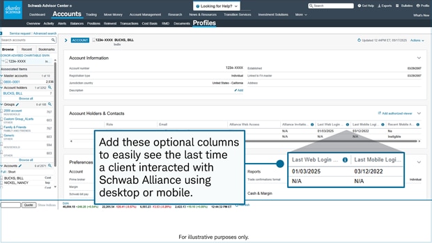 View your clients' most recent login to Schwab Alliance on the updated Profiles page