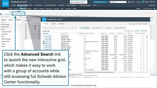 Now you can open an interactive grid that makes it easy to create a working list of accounts you're reviewing. This new view helps streamline your interactions while maintaining access to the other Schwab Advisor Center functionality you rely on.