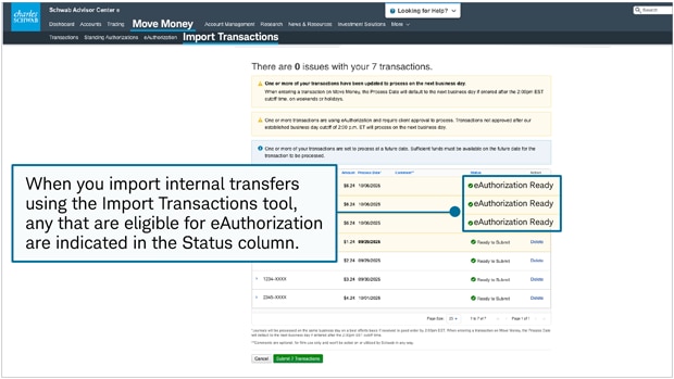 Now you can send internal transfers that you upload via the Import Transactions tool to clients for approval via eAuthorization. This new feature does not require that you modify the CVS file you are currently using to import internal transfers, and the system automatically designates the first account owner eligible for eAuthorization as the approver.
