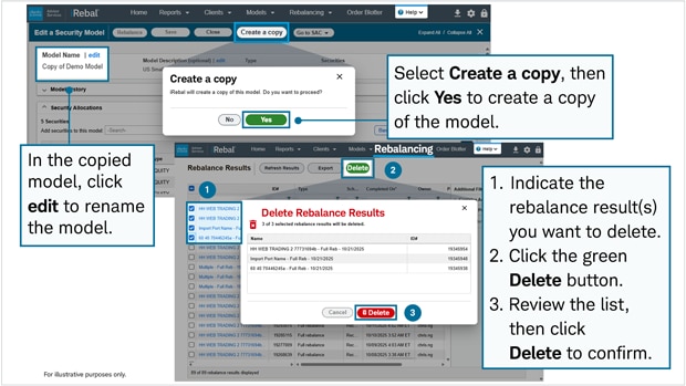 - With Copy Model and Delete Rebalance Results, you can now copy and modify existing models by choosing Create a copy from the Models menu or from the Edit a Security Model screen, available for both security models and blended models. You can also remove rebalances that are no longer needed by checking the results and clicking the Delete button at the top of the page.