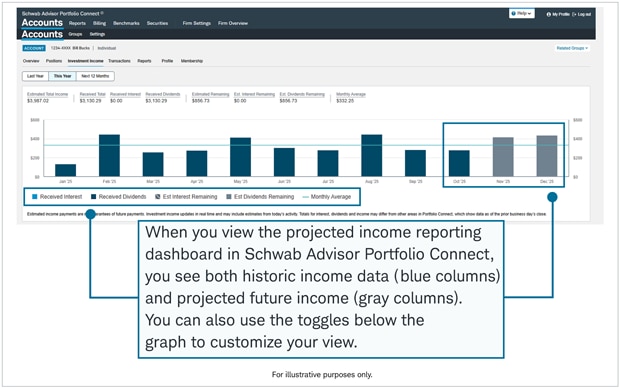 Schwab Advisor Portfolio Connect's reporting dashboard has expanded to present projected income data in addition to the historical data that was already available. The projection is presented in an interactive graph that maps out 12-month forward-looking average monthly income estimates, which can help facilitate conversations with clients. To learn more about Schwab Advisor Portfolio Connect, visit the Schwab Performance Technologies® website.